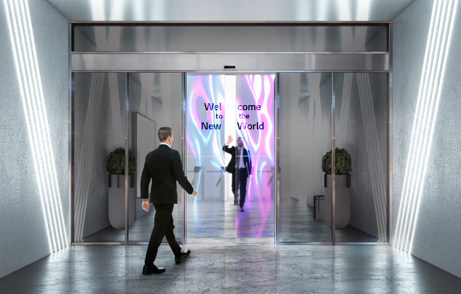 La sudcoreana LG in collaborazione con il produttore svedese Assa Abloy Entrance Systems, hanno presentato per la prima volta, un sistema di porte scorrevoli automatiche, con pannelli Oled trasparenti. Pensato per accogliere e informare i clienti nelle strutture aperte al pubblico, come centri commerciali, showroom, aeroporti, e anche la pubblicità, che non mancherà di impadronirsi di questo futuro supporto.